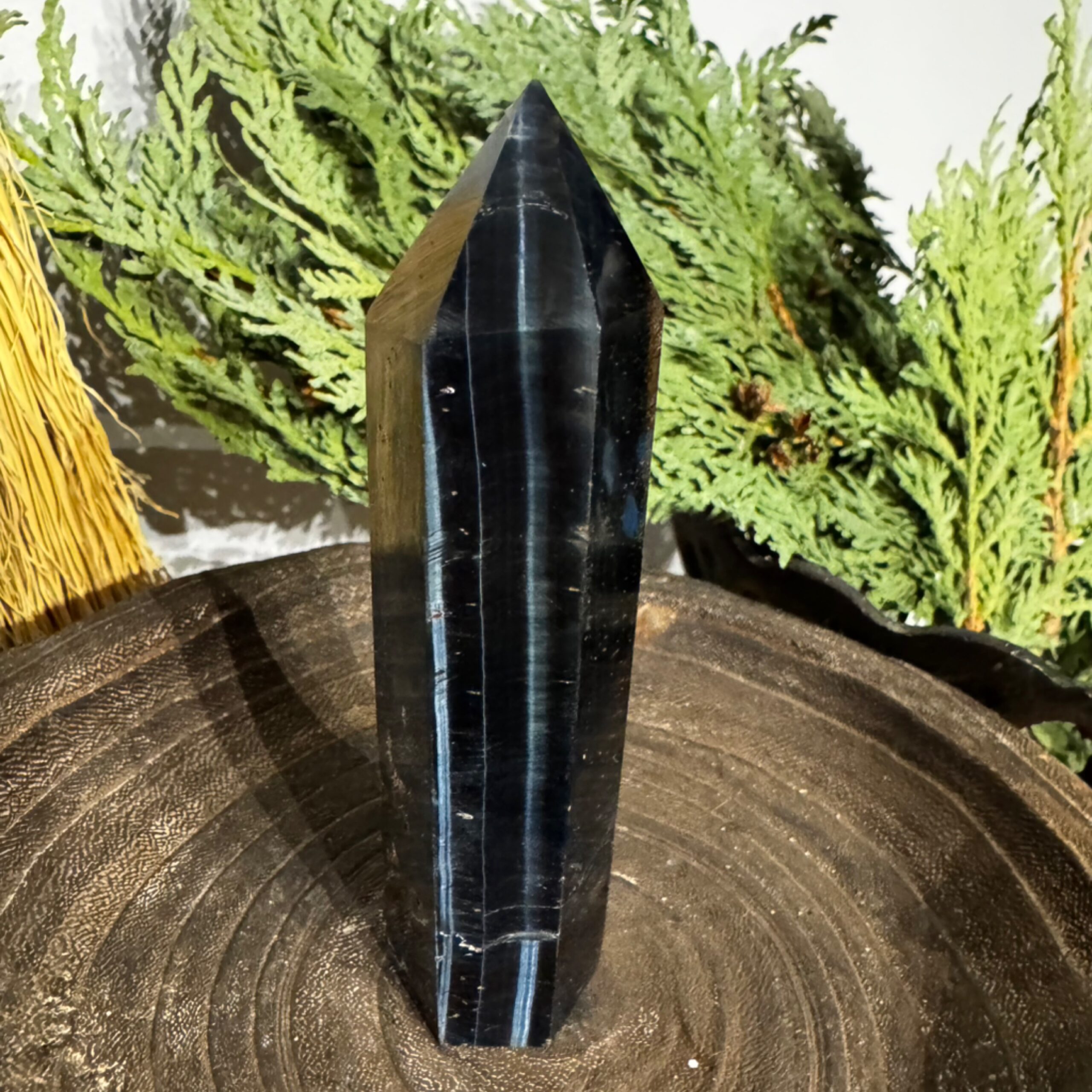 The Blue Tigers Eye Tower features a stunning blue hue and a unique tower shape, making it a striking addition to any collection. Known for its positive energy properties, it is ideal for both decor and mindfulness practices.