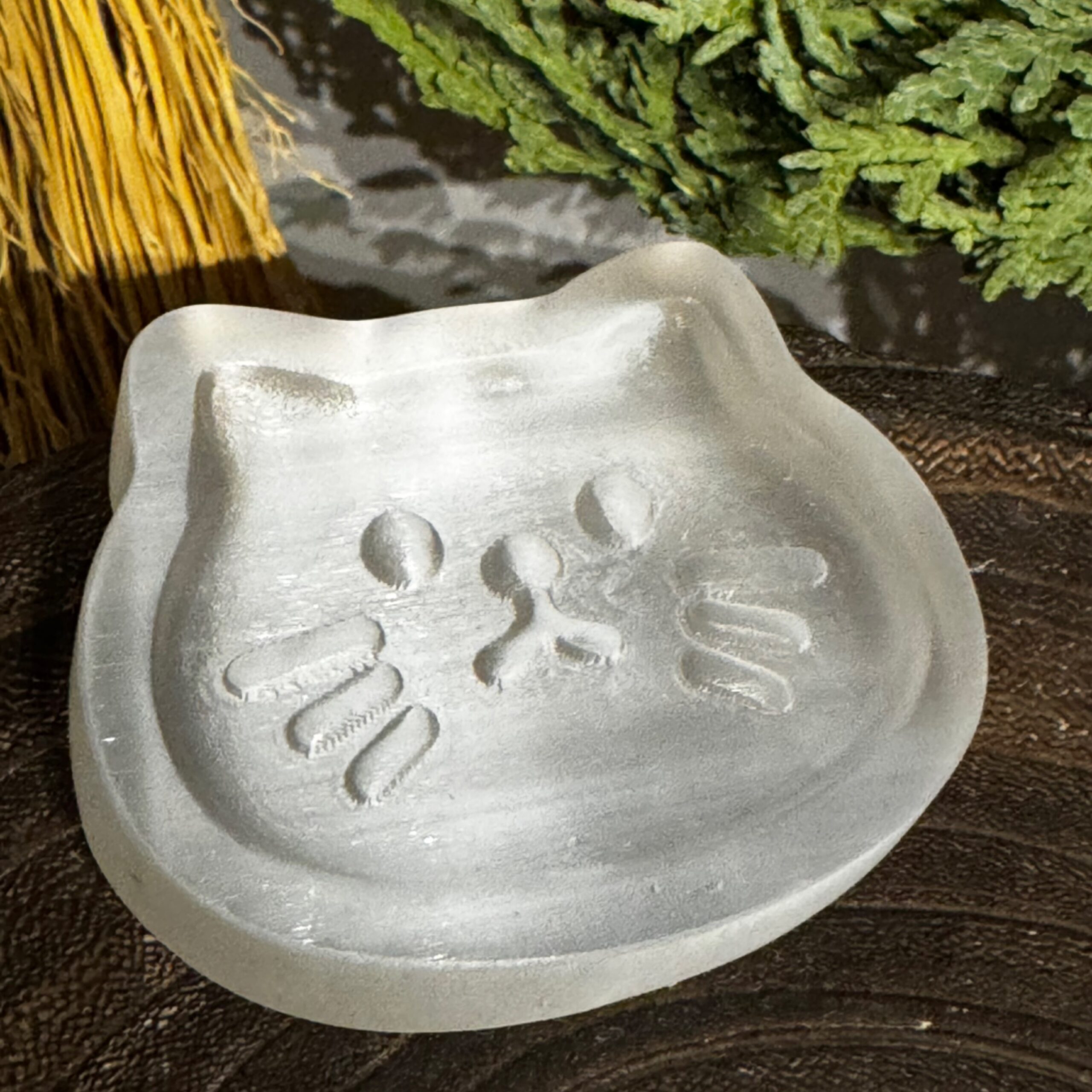 This Selenite Cat Tray showcases natural selenite with intricate hand-carved details in a charming cat design. Perfect as a decorative piece or for holding small items, it adds a unique touch to any space.